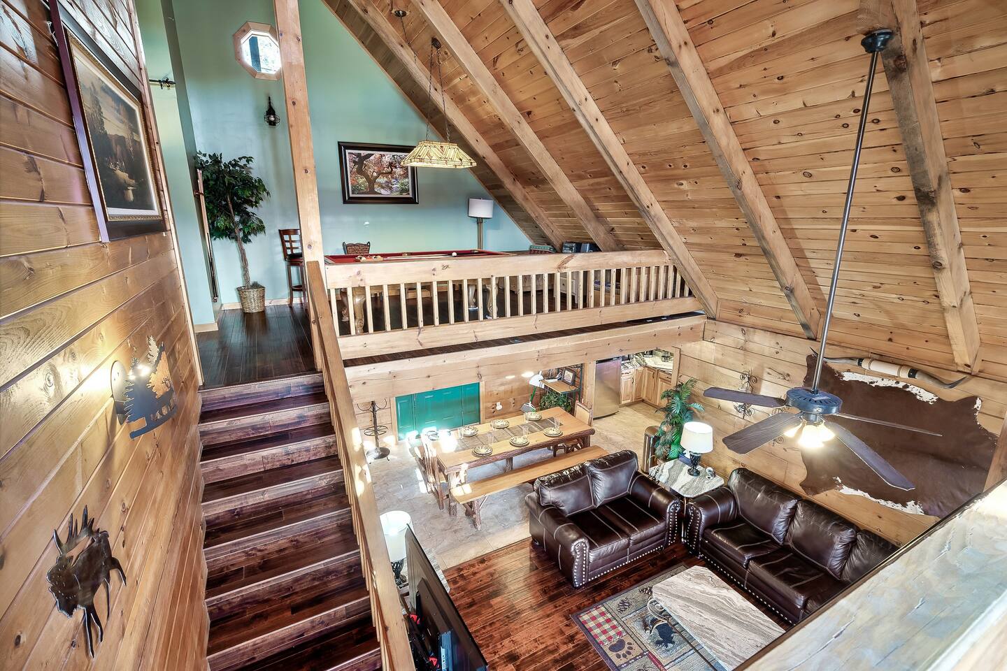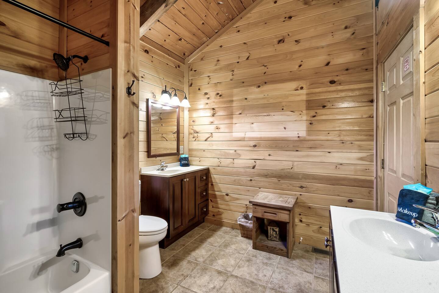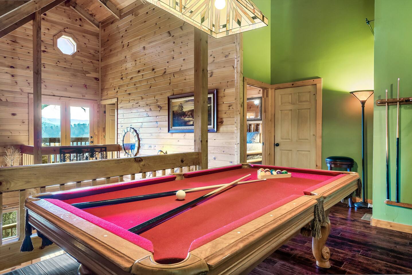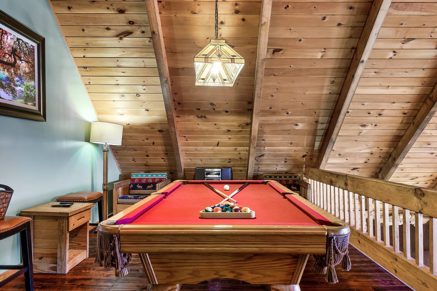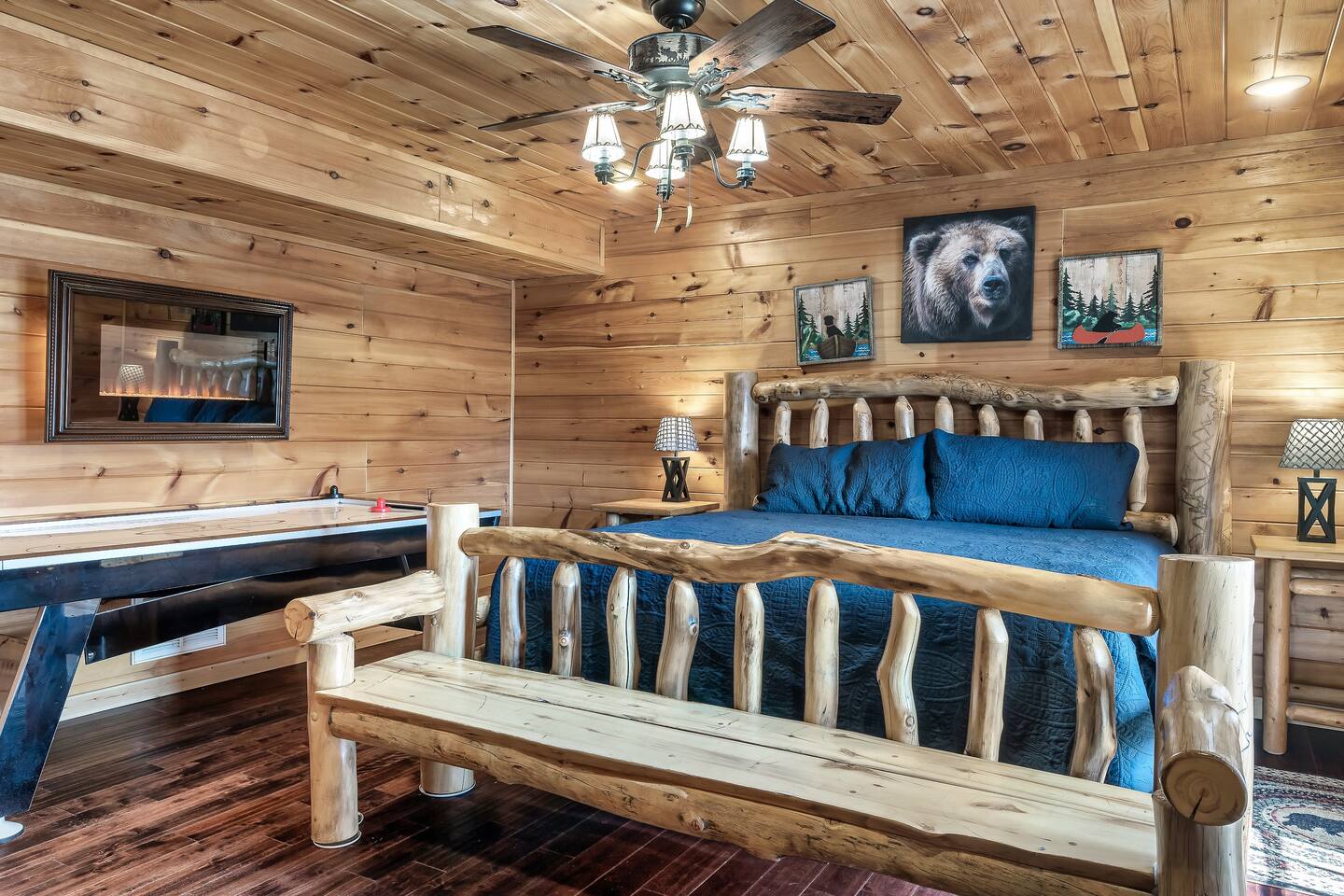 Relax and unwind in the screened-in 6-person hot tub with a sitting room, or enjoy friendly competition with the pool table and air hockey. Stay entertained with 4 TVs featuring Roku streaming and a selection of board games. As part of the Shagbark Resort community, your cabin reservation includes access to fantastic amenities such as an outdoor pool (open Memorial Day to Labor Day), pickleball, tennis, basketball courts, cornhole, frisbee golf, a playground, picnic pavilion, fitness trail, and a community center available for rent. Each of the three deck levels offers a unique experience. The main level deck features ample seating, a gas grill, and a picnic table, with access to the screened-in sitting room and hot tub. The private upper-level deck provides a porch swing and chairs for enjoying mountain views, while the lower-level deck offers a private couples' escape with a table and chairs. Step inside the cabin to admire the beautiful wood interior and craftsmanship. The spacious living room, dining area, and fully equipped, remodeled kitchen create a welcoming atmosphere. Relax by the cozy stone gas fireplace, enjoy the comfortable seating area, and watch your favorite shows on the 70" flat-screen HD TV. The main level also features a king-size bedroom with a 50" TV, private bathroom, and direct access to the hot tub. The lower level offers a second bedroom with a plush king-size bed, a 42" TV, and a private bathroom. Have fun with the air hockey table and enjoy the private balcony with a bistro table and chairs. Head upstairs to the loft game room with a pool table and the third bedroom. This bedroom includes a queen-size bed, seating chairs, a 32" TV, and a private bath. Relax on the private deck with a porch swing and breathtaking views. Throughout the cabin, you'll find unique log furniture and stunning Smoky Mountain beauty at every turn. CABIN LOCATION: This lovely log cabin is located down Walden's Creek Road, on the Wears Valley side of Pigeon Forge, situated in the mountainous woodlands. When you're ready to leave your cabin retreat, you can enjoy all that the area has to offer, whether it be hitting the main Parkway in Pigeon Forge (25 minutes) or exploring the Great Smoky Mountain National Park or Gatlinburg (40 minutes). Note: Please be advised that there is construction underway at a neighboring cabin, which is beyond our control. You may experience construction noises during this time. The construction team is permitted to operate between 7 am & 7 pm, although their presence on-site may vary. We apologize for any inconvenience this may cause and appreciate your understanding.